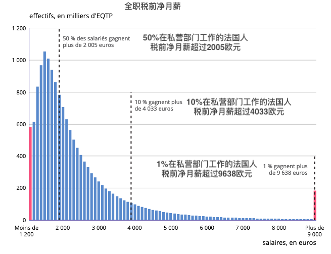 中位数意味着50%在私营部门工作的法国人每月的净收入不到2005欧元,而另一半人收入高于2005欧。