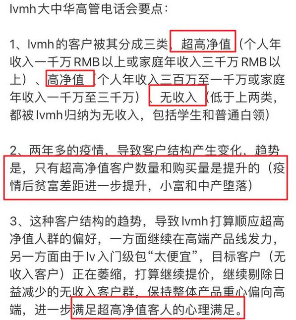 最近许多朋友都在转发一张图片,它显示的是LVMH大中华高管电话会议要点,就是它: