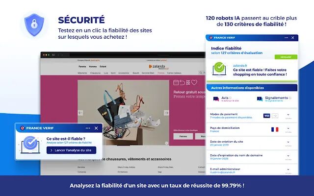 France Verif软件可以恢复买家在虚假网站上交易的详细信息,包括对方交易者的真实身份、被骗银行卡的信息。为了应对这些骗局,软件还会自动检查相关网站站点的地址,并将其与真实站点的地址进行比对。