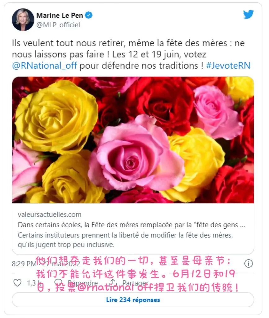 小学教师玛蒂尔德今年决定与她的学生一起庆祝“我们所爱的人日”。“我们有几个失去父母的孩子,”她在推特上写道,“我们不禁止母亲节,但我们不希望这对某些人来说是一种困难”。
