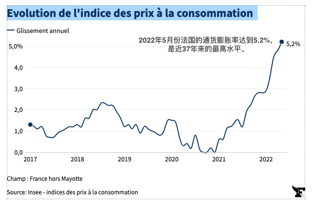 根据法国国家统计与经济研究所(INSEE)5月30日发布的初步数据显示,5月份法国的通货膨胀率再次加速,超过4月份的4.8%,达到5.2%。这是自1985年9月以来首次超过5%,也是近37年来的最高水平。