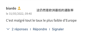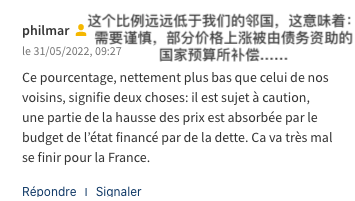👉网名是“philmarphilmar”的网友态度就更为谨慎了,他认为:“这个比例远远低于我们的邻国,这意味着:需要谨慎,部分价格上涨被由债务资助的国家预算所补偿。这对法国来说将是非常糟糕的结局。”