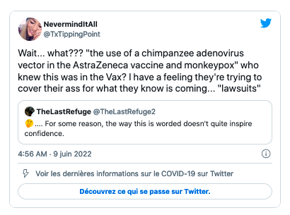 等等...什么?“在阿斯利康疫苗和猴痘中使用了黑猩猩腺病毒载体”,这居然在疫苗中?我有一种感觉,他们正试图掩盖事实,因为他们知道即将发生的事情...... “告他”