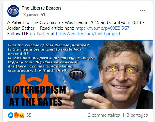 在新冠疫情开始时,美国阴谋网站The Liberty Beacon就发布谣言称“比尔·盖茨资助了拥有冠状病毒专利的皮布赖特研究所”,认为他是新冠疫情的“幕后操纵”......