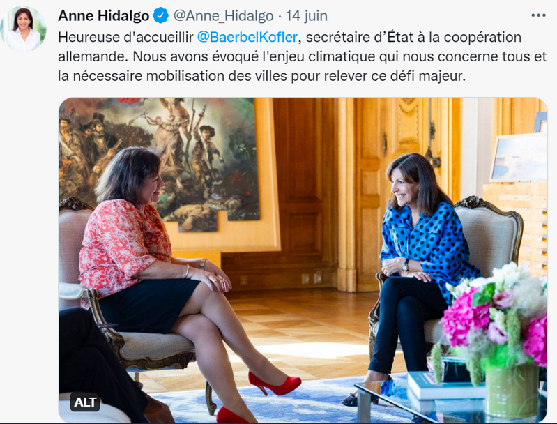 那安妮·伊达尔戈这两天在干嘛?眼尖的网友们找到了忙碌的巴黎市长——在开会!聊别的事!(下图来源于伊达尔戈自己发的推特,时间是6月14日,正是巴黎垃圾收集工人罢工的第二天。)