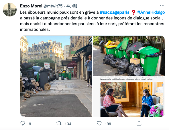 名叫“Enzo Morel”的网友说:“市政垃圾收集者在罢工❓ 安妮·伊达尔戈......却选择放弃巴黎人的命运,宁愿选择国际会议。”