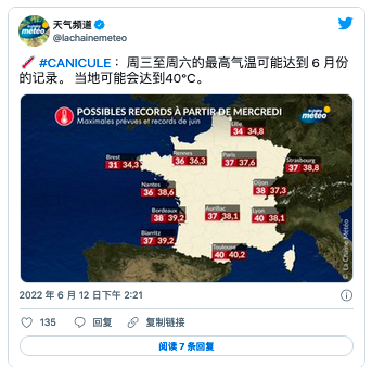 从6月15日至18日一场撒哈拉热浪横扫法国,温度持续升高,预计峰值将超过40℃,将创下6月中旬的高温纪录。(点击详情:最高气温40℃!法国提前迎来“热浪”天气!如何“冷静”应对?)