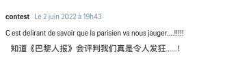 当网友contest在常看的《巴黎人报》上看到转发的这个报告时,表示:“知道《巴黎人报》会评判我们真是令人发狂……!”