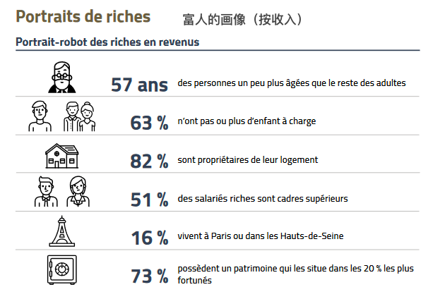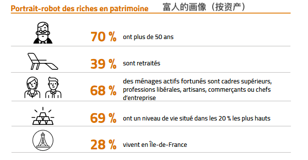 然后,从资产来看,70%的富人年龄超过50岁;39%已退休;68%是高级管理人员、自由职业者、工匠、店主或公司董事;69%的人生活水平处于法国人之中的前20%;他们当中28%的人住在法兰西岛。
