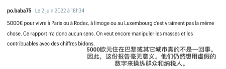 网友po.baba75说了句大实话:“5000欧元住在巴黎或其它城市真的不是一回事。 因此,这份报告毫无意义。他们仍然想用虚假的数字来操纵群众和纳税人。”