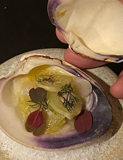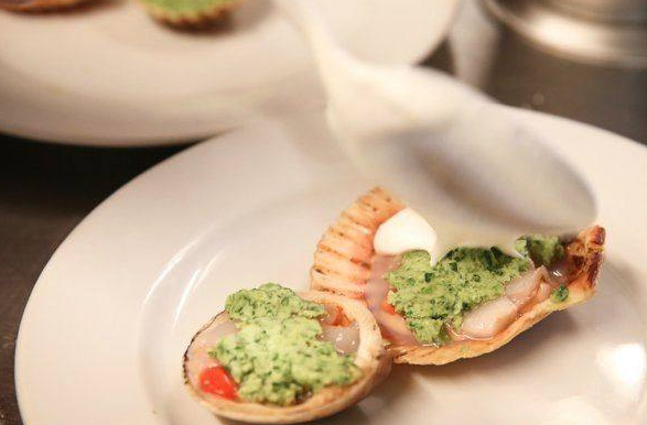 食物推荐:甜菜根腌韭葱配褐黄油 /烟熏西兰花泥跟西兰花奶油挞饼 / 青口跟小番茄配青口褐黄油汤汁 /诺曼底牡蛎佐小葱油和酢浆草冰沙 / 渍白醋栗和樱桃凉汤