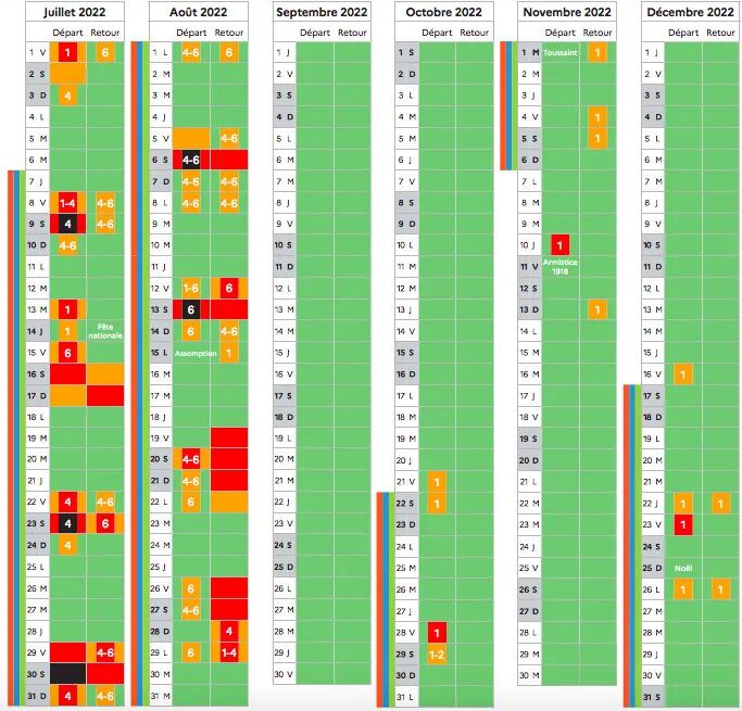 为了提前避免堵车情况,大家可以到交通预测网站(https://www.bison-fute.gouv.fr/)提前了解情况。这个网站会发布一个日历,如果是繁忙拥堵的日子,会用红黑标签来提醒。