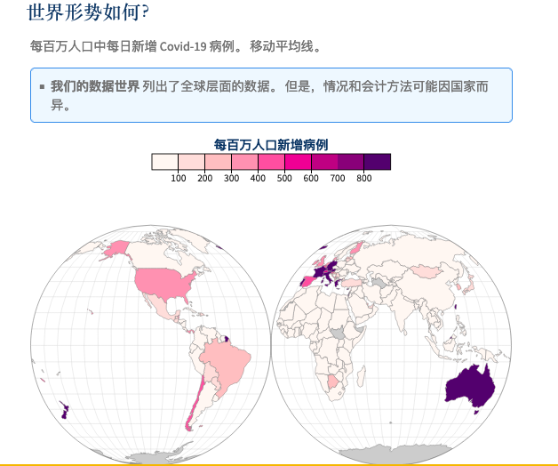 按每百万人口中每日新增病例来统计,颜色越深,则疫情越严重。