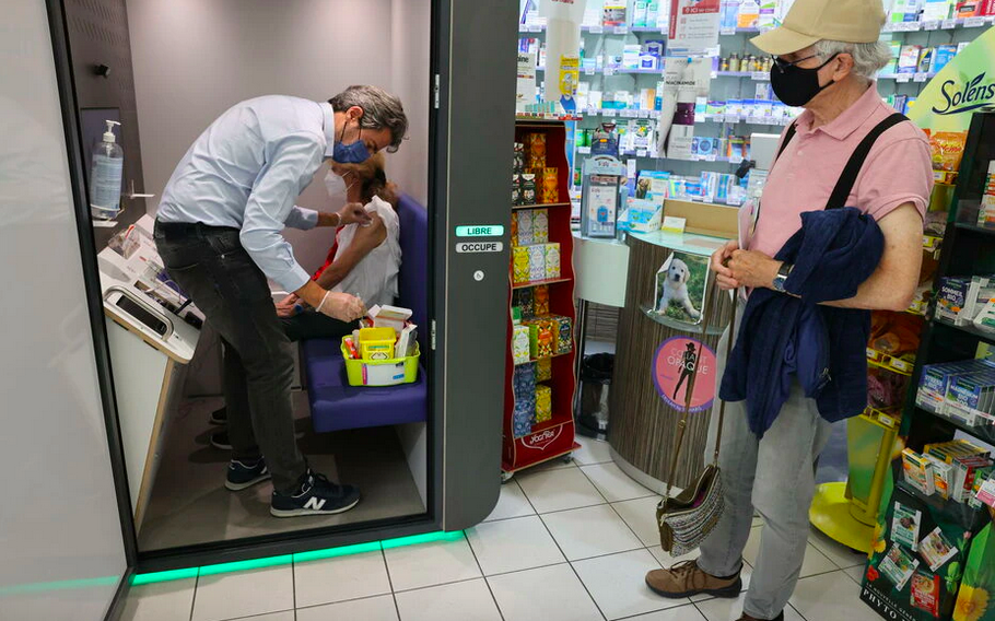 在药房里,61岁的尼古拉(Nicolas)非常熟练地解开了衬衫的扣子,伸出手臂,来接种疫苗第四针,他说:“我感觉疫情高峰再次到来了。”