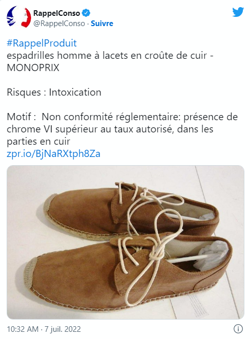 Rappel Conso 指出:Monoprix出售的运动鞋会存在与皮肤接触过敏的风险,皮革部件中六价铬的含量将高于规定的含量。