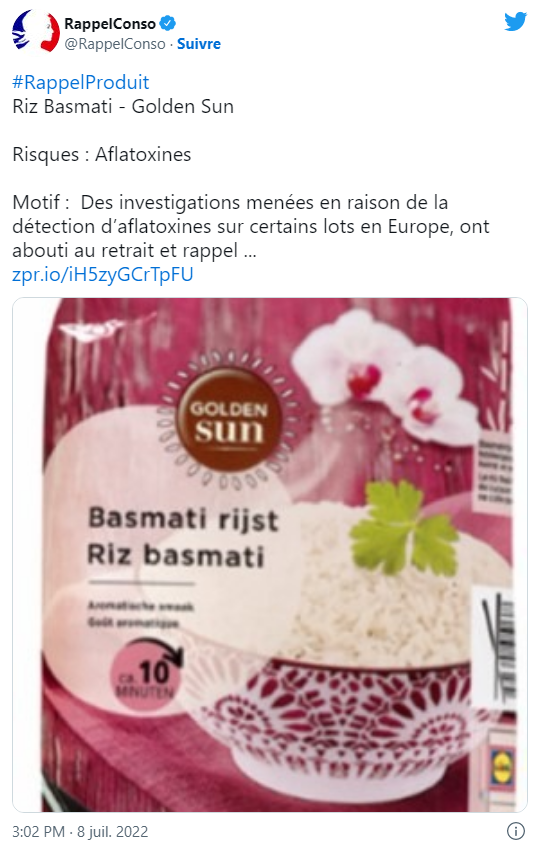 Rappel Conso 指出:法国各地销售的Basmati大米同样有问题,它们被黄曲霉毒素污染。