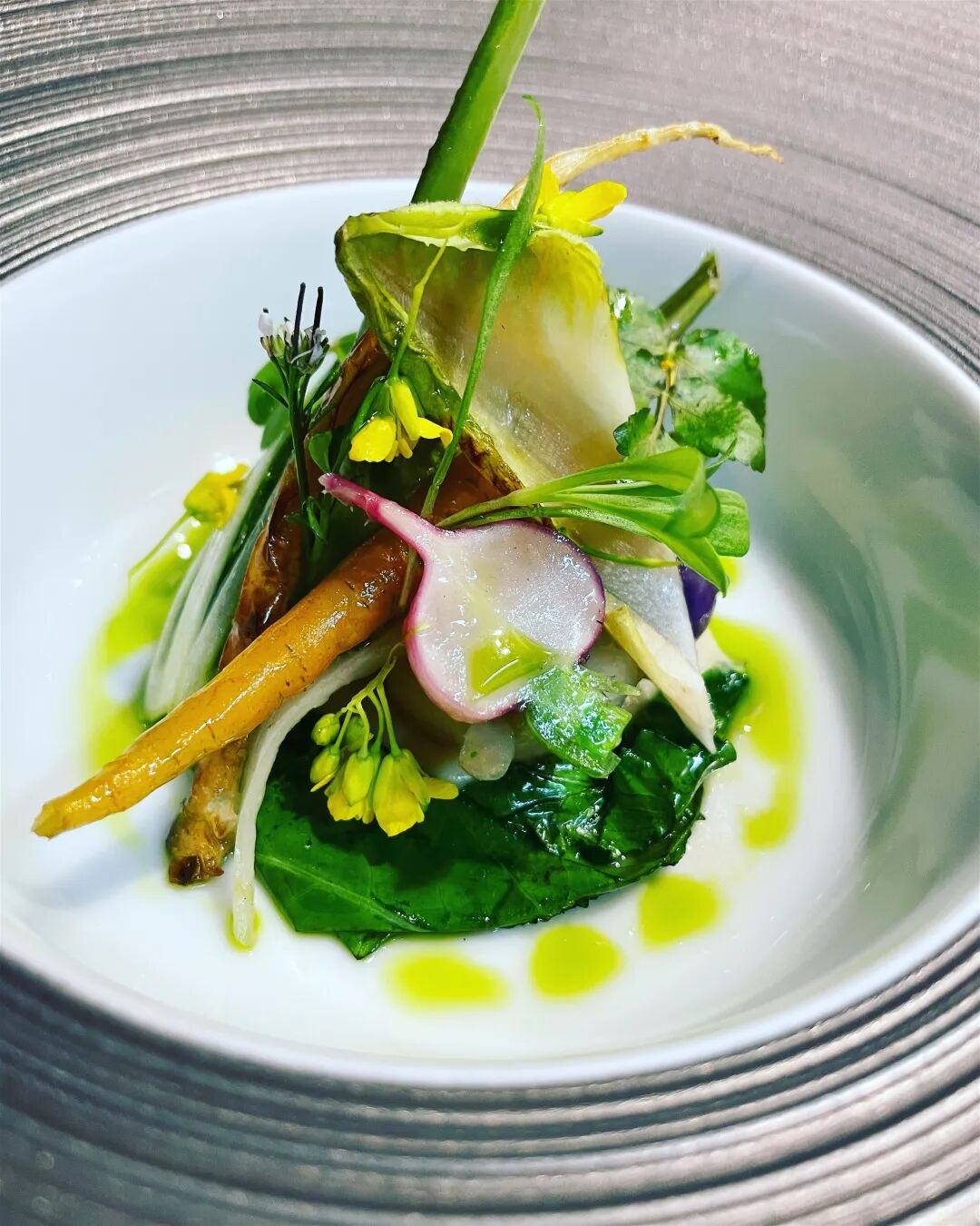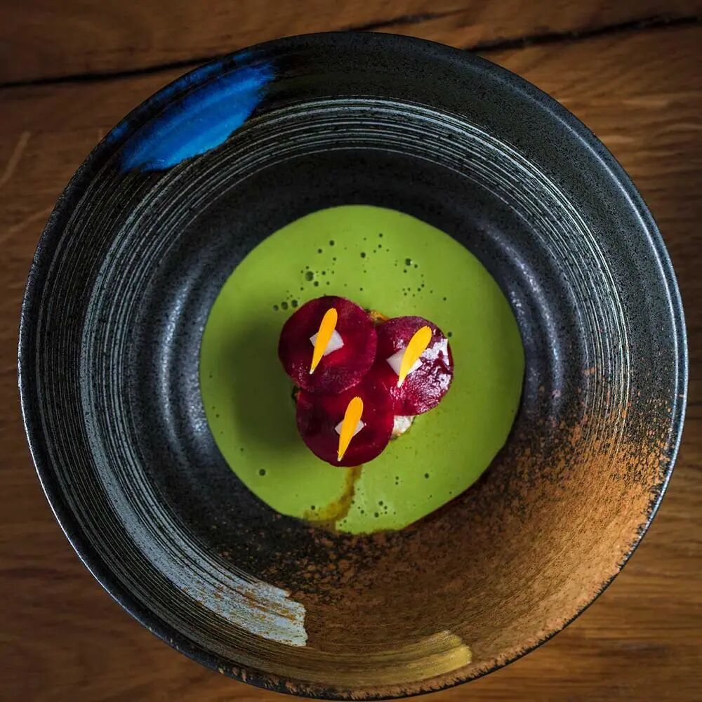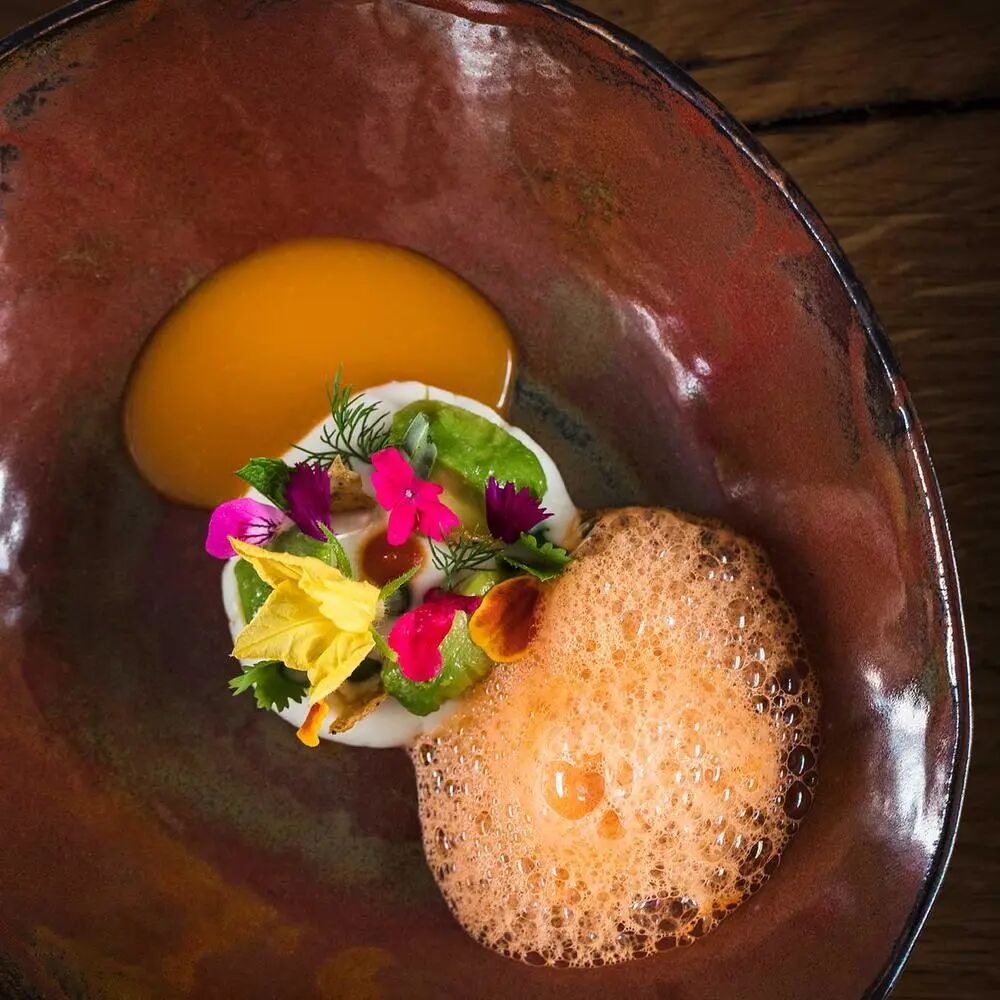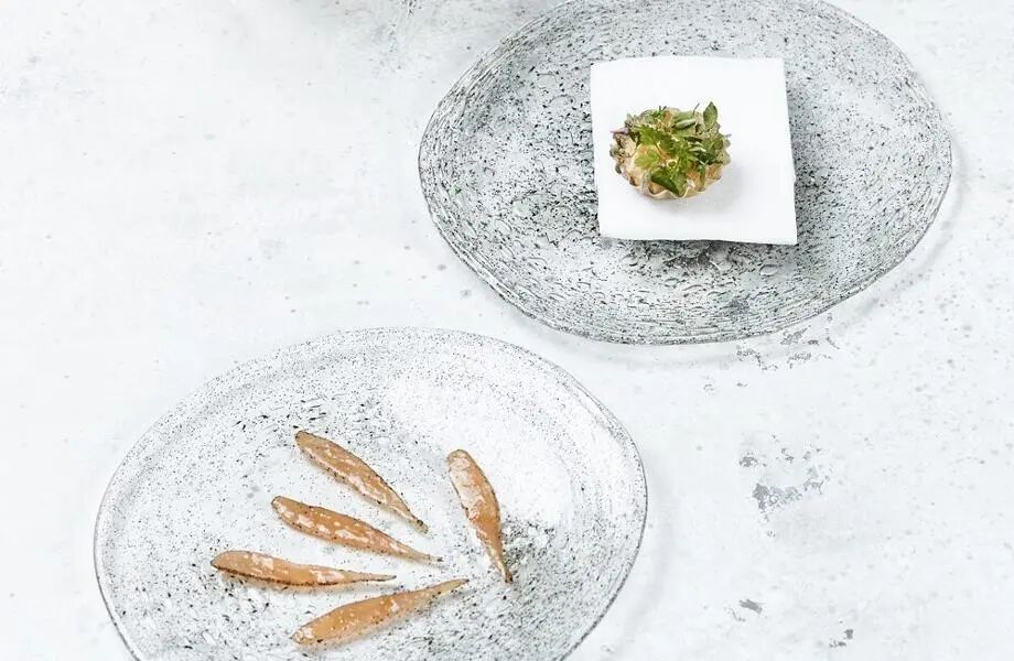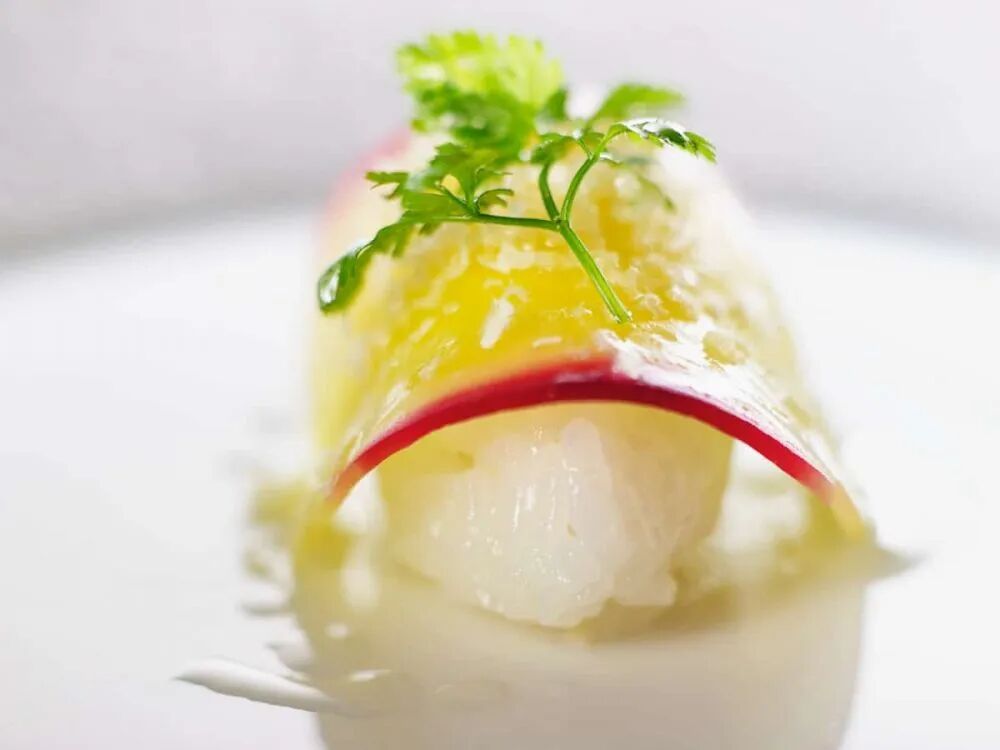 主厨亚历山大·马齐亚(Alexandre Mazzia)在刚果民主共和国长大,他的菜单上主要是蔬菜、鱼和海鲜。受到非洲文化的影响,他将小胡瓜花放入绿色沙茶、藏红花白汁、结晶海藻和白干酪等菜肴称为“情感烹饪”的一部分。