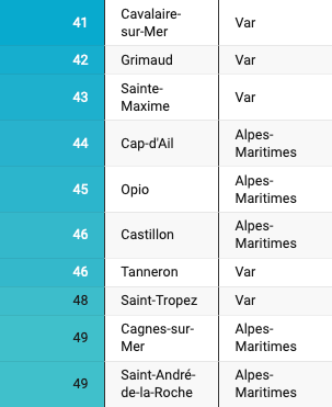 那么,在蔚蓝海岸的一系列城镇中,哪个最宜居呢?根据大约三十个指标,比如安全、环境、污染、交通、房地产、休闲活动、商店、服务,等等,进行比较了位于耶尔(Hyères)和芒通(Menton)之间的80个城镇的生活质量。