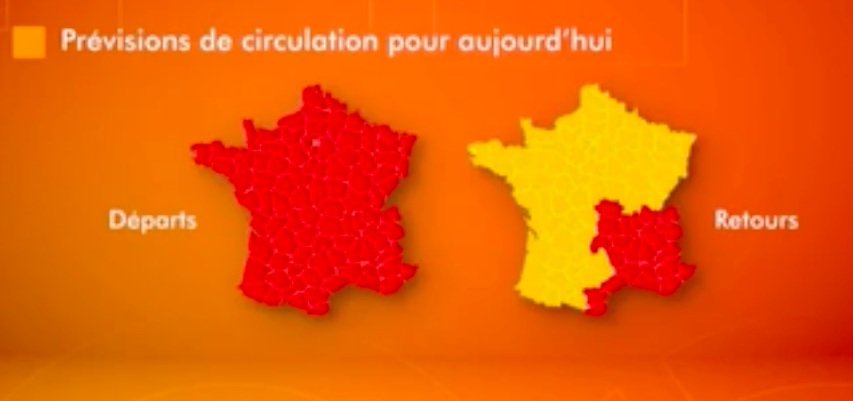 红色是塞车的情况,左边的图是出发的情况,塞车从7月29日周五早上开始,一直持续到晚上。哪里塞车呢?东西南北中,全法一片红海啊!
