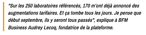 自2021年以来,它提供包含10万个商品资料的价目清单。它的创始人奥黛丽·勒科克(Audrey Lecoq)说:“在过去的两个月里,与我们合作的320家实验室中,有80%重新涨了价,涨幅大约是7-15%。”而且,这些涨价没有表明确切的原因,她感到“很遗憾”,这意味着她的价目清单也必须调整。