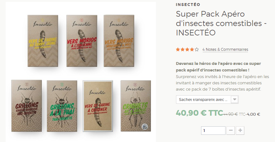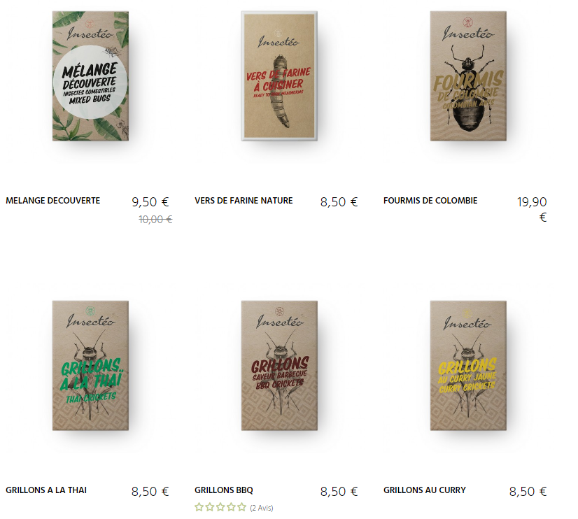 在法国公司Micronutris的网站上,可以订购各种昆虫小食,作为开胃零食,或者petit faim。他们也拥有丰富的口味,例如烧烤味。Micronutris还提供含有不同口味的完整昆虫的饼干:芝麻、百里香、墨西哥味,德克萨斯味。