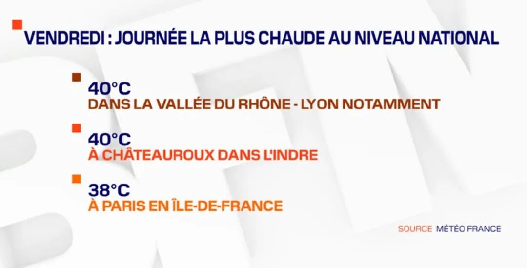 到了周五,法国大多数城市气温都将会超过35℃,巴黎的气温预计在38℃左右,而里昂(罗讷河谷)将有可能达到40℃。