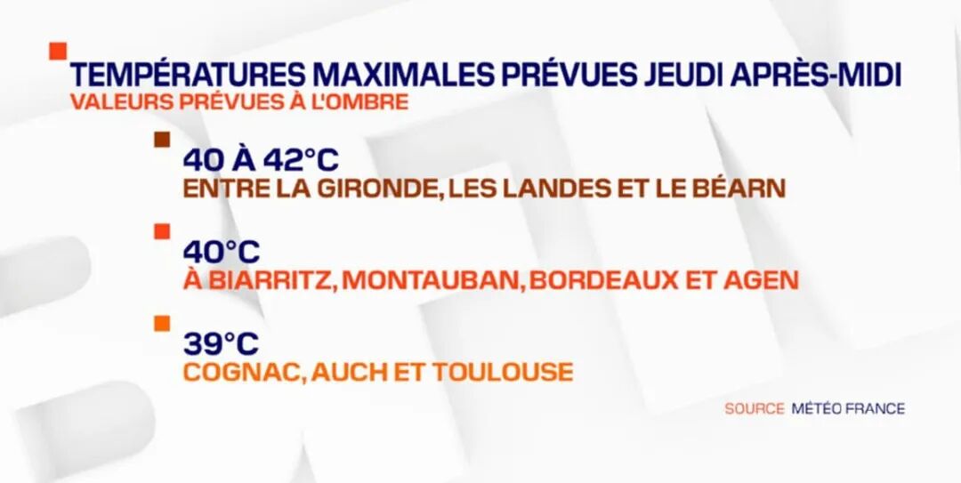 周四下午,新阿基坦大区吉伦特省 (Gironde)、朗德省 (Landes)和贝阿恩省(Béarn)气温将会达到40到42℃;比亚里茨(Biarritz)、蒙托邦 (Montauban)、波尔多和阿让市 (Agen)气温预计在40℃;科尼亚克 (Cognac)、欧什 (Auch)和图卢兹的气温则预计在39℃。