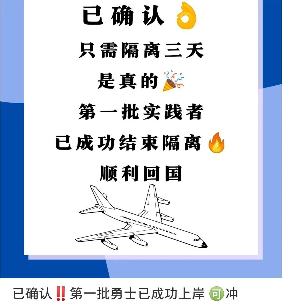 根据最新消息,已经有小伙伴“上岸”了——真是幸运呢!也就是说,他/她在订机票时还不知道这样的“好事”,准备起飞时刚刚得知这个新政策,然后住着住着发现不用住7天那么久——(8月12日)这就顺利回国啦!