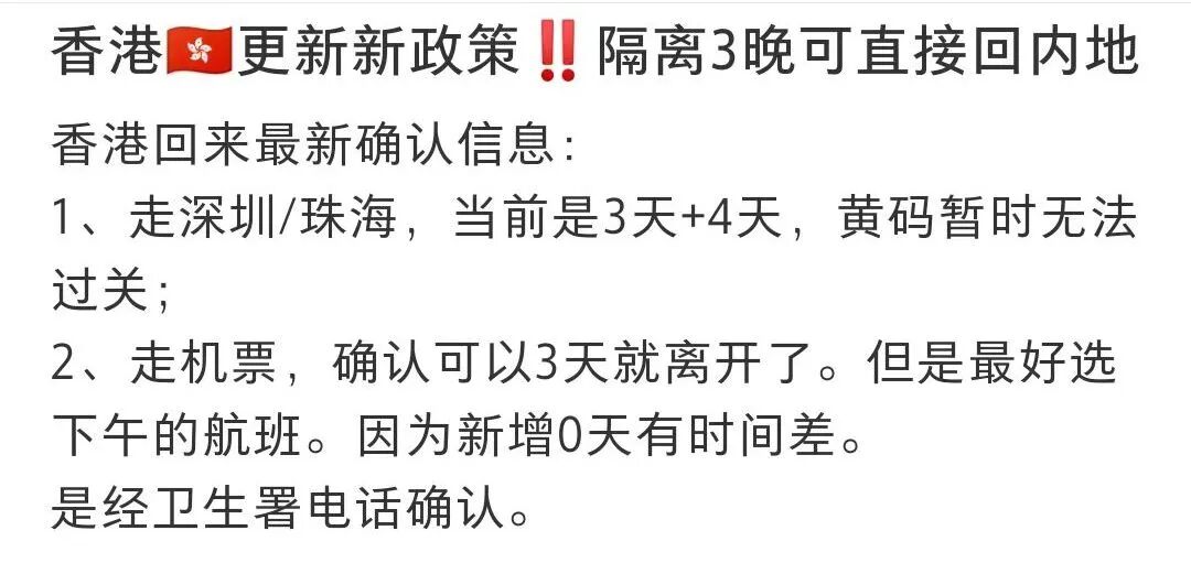 但根据更多的信息,似乎只有坐飞机回内陆,也就是走航路的,才只需隔离3天。所以,友友们一定要根据自己的行程打听清楚,最好得到香港卫生署或者航司的确认。