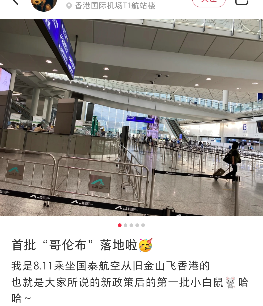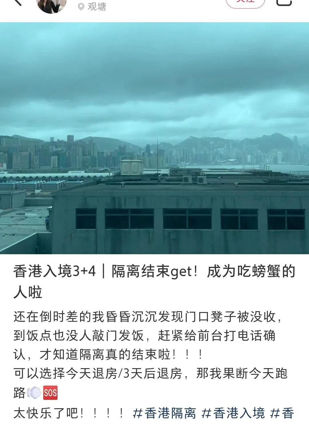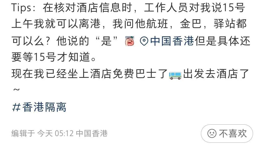 这位朋友自称是“首批哥伦布”,又调侃自己是“新政后的第一批小白鼠”,这是他/她8月12日刚刚落地香港时发出的信息:酒店工作人员说他/她3天后,也就是8月15日就可以离开了。