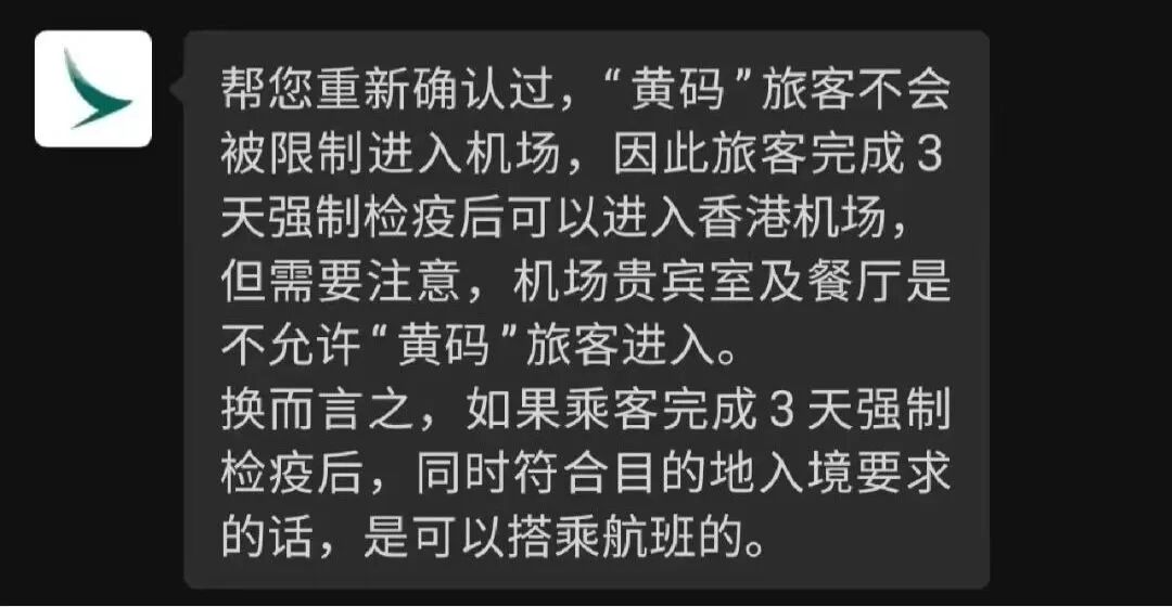 从航司回复的信息来看,完成3天检疫酒店隔离的,且符合目的地入境要求的,可以进入机场乘坐飞机(飞回内陆),只是不能够进入机场贵宾室和餐厅而已。