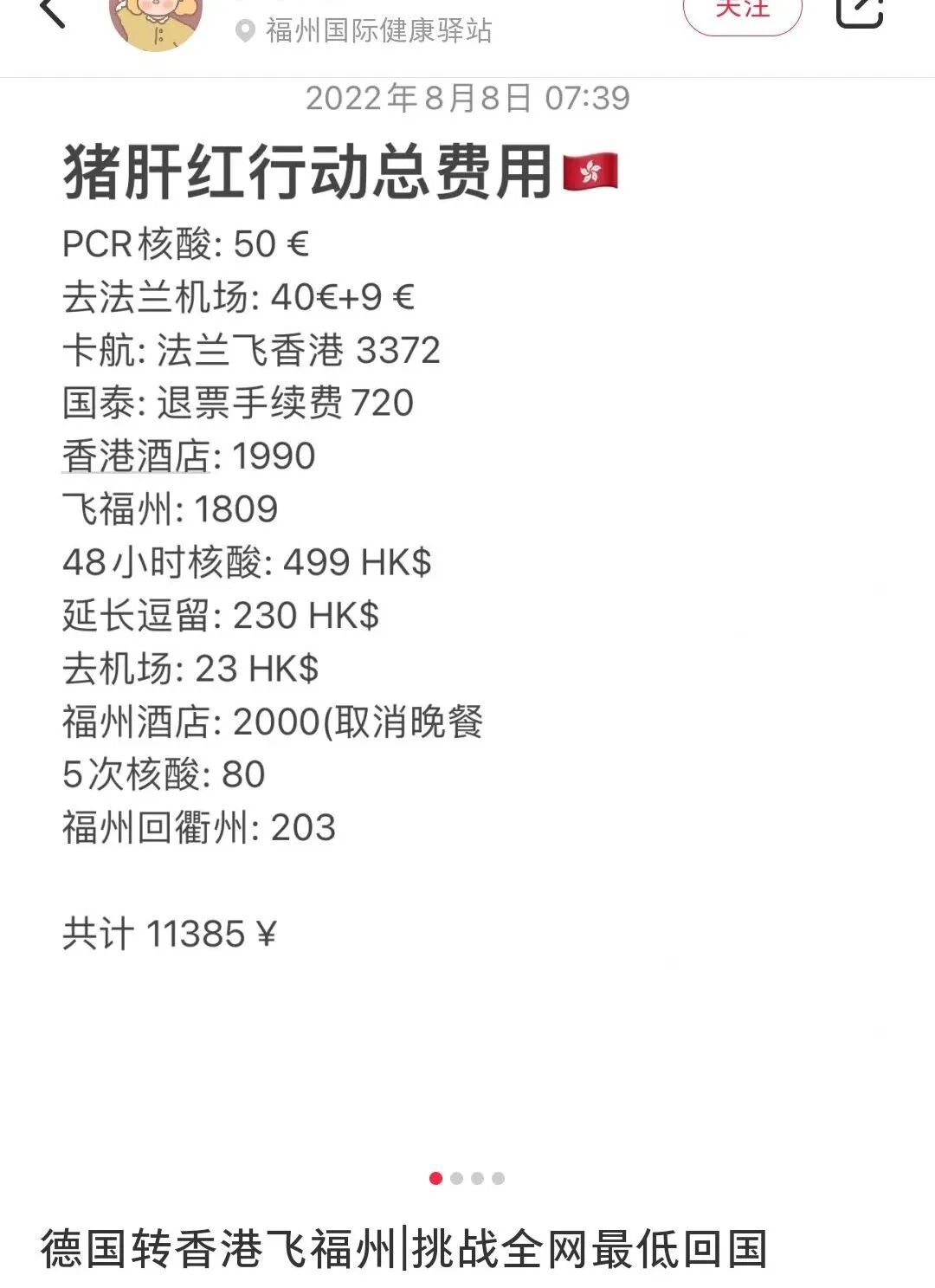 对于从法国回国的朋友,我们加上从法国到德国法兰克福的交通费用,再减去8月12日新政后香港可以少隔离4天的酒店费用,估计差不多也是这个数呢!