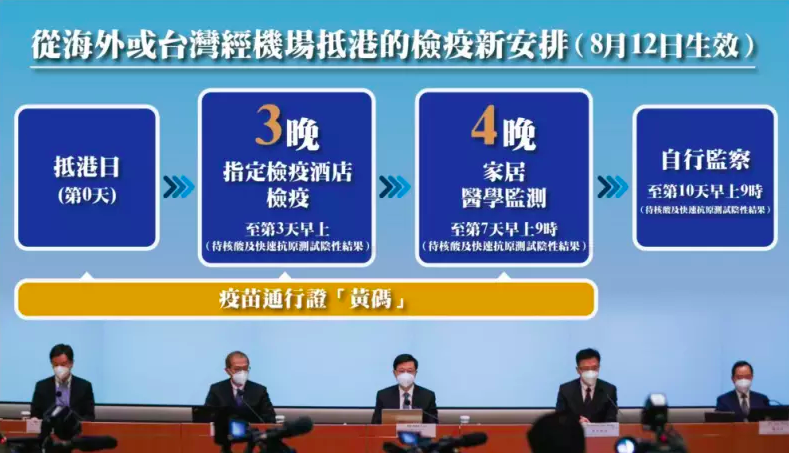 根据香港特区行政长官李家超此前公布,放宽入境检疫措施,缩短海外或中国台湾地区经机场入境的抵港者检疫酒店隔离日期为3天,另加4天居家医学监察,8月12日起生效。 |
