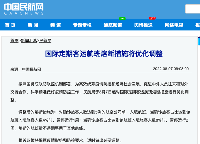 虽然,民航局于8月7日起对国际定期客运航班熔断措施进行优化调整:
