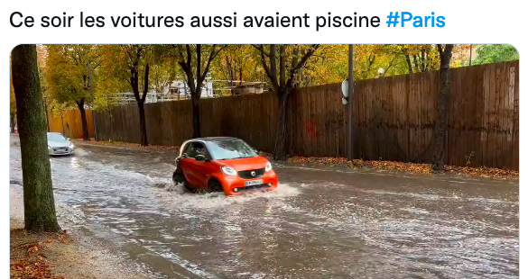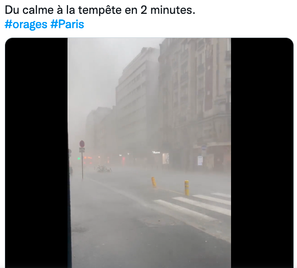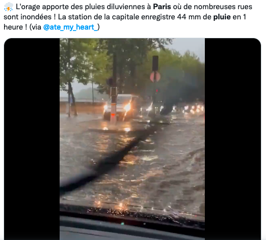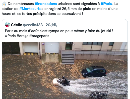 “今天(8月16日)晚上,巴黎在1个小时内降下了46毫米的雨水,也就是说,与今年(2022年)6月30日至8月15日期间的降雨量相当! 这是自2018年6月11日(当时的暴风雨在巴黎造成72毫米的降雨量)以来,24小时内最强的降雨量!”