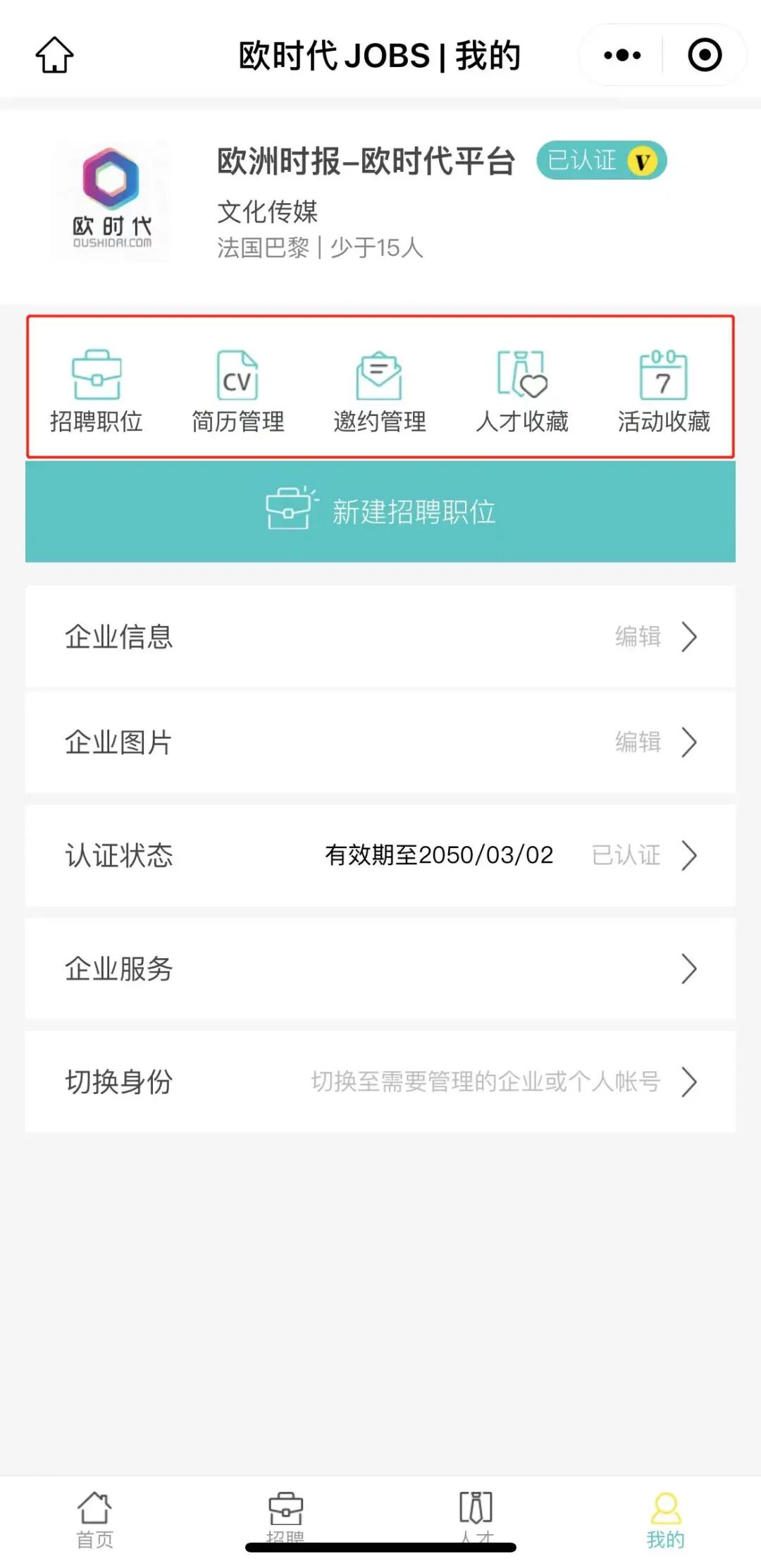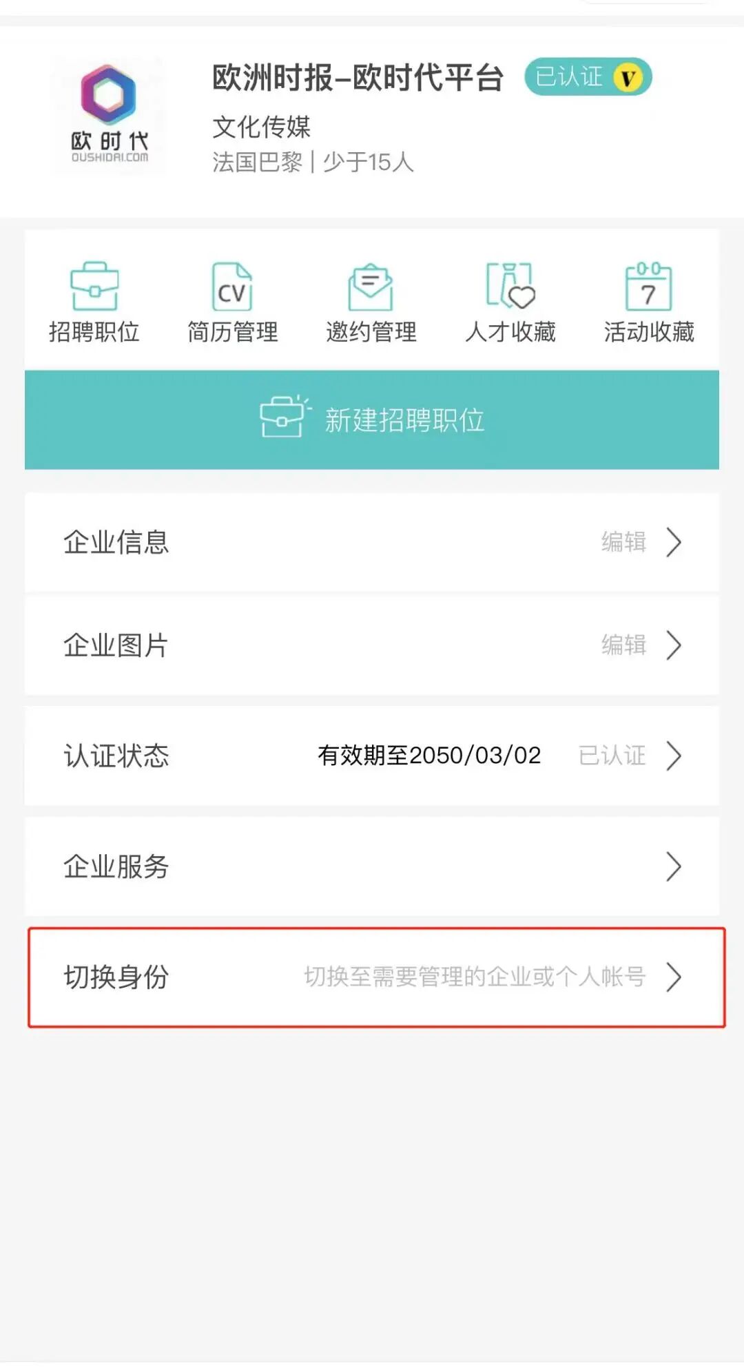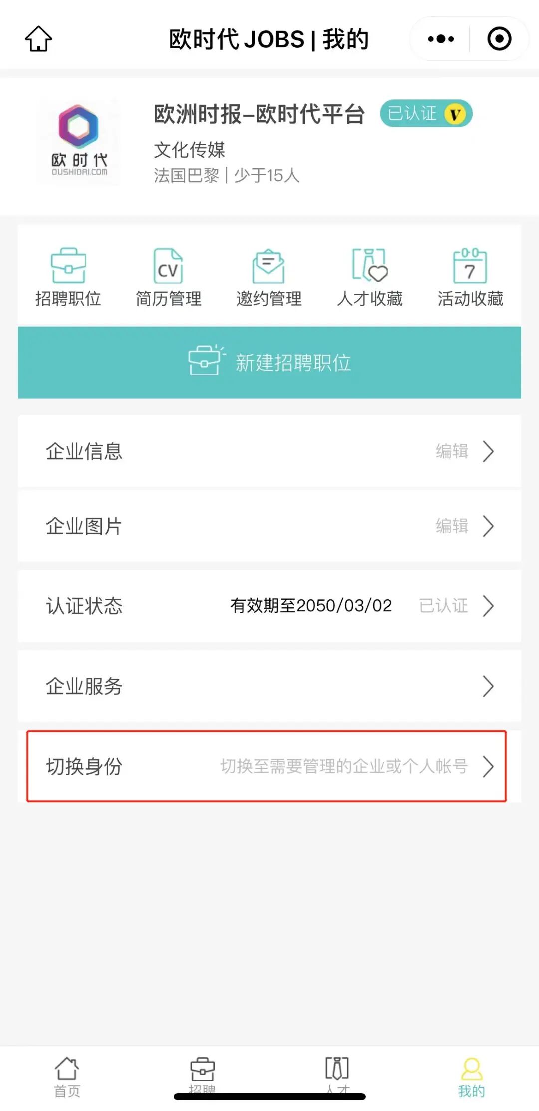 审核通过后,您可以通过“我的”>身份切换页面,选择要管理的企业切换身份,在切换后页面内点击中“新建招聘职位”,进入职位详细信息填写界面。所有内容填写并检查无误后,即可选择保存并发布该职位。您也可以仅保存该职位,在需要时进行发布。