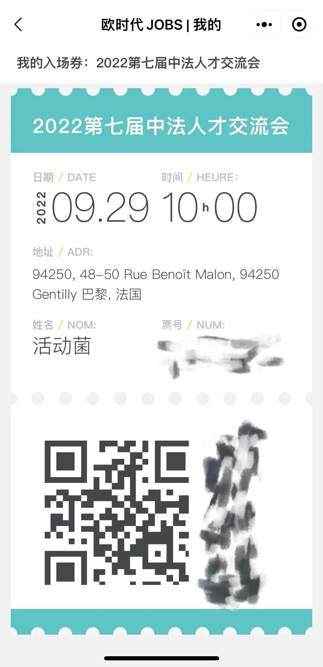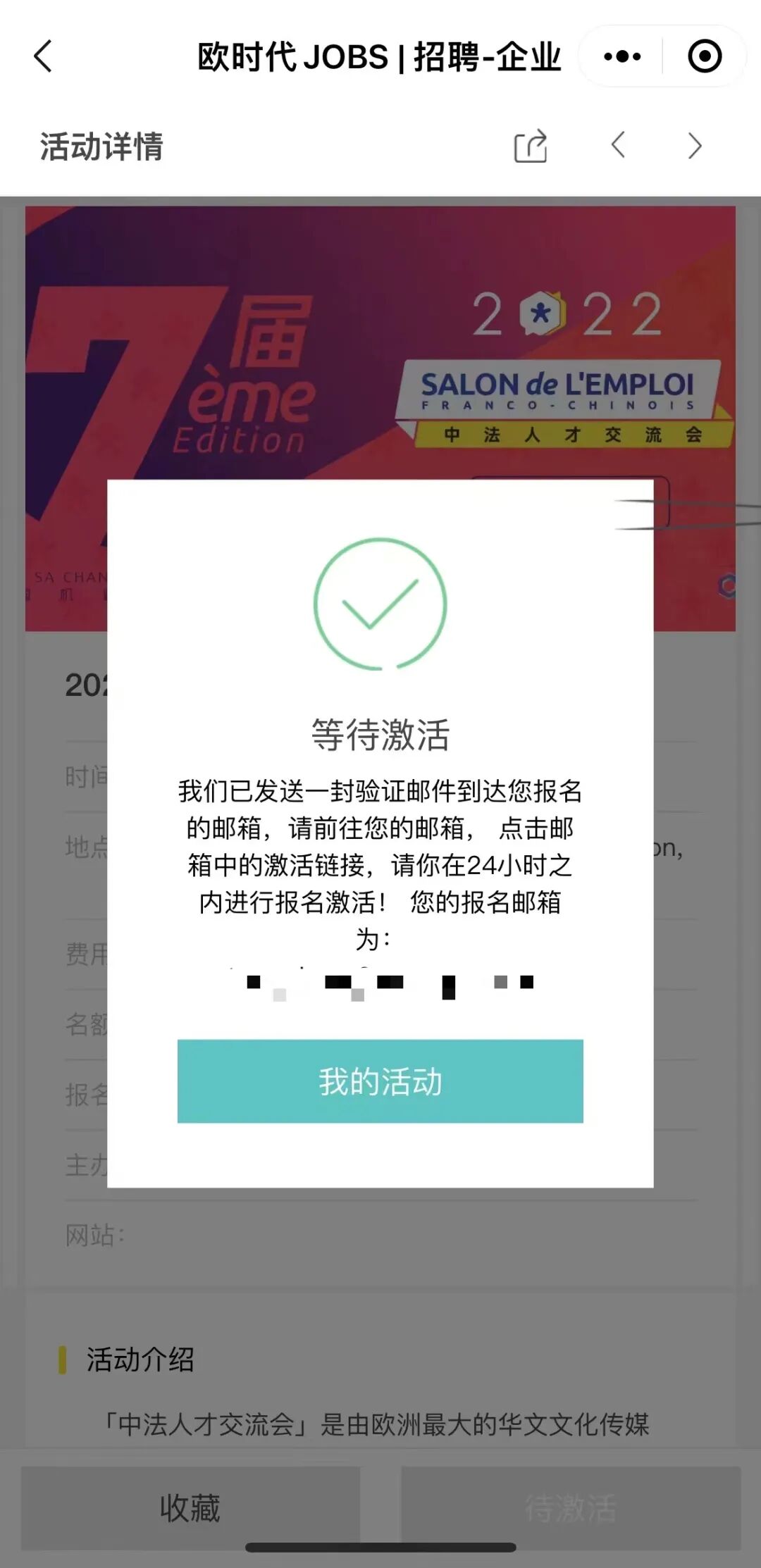 激活成功后您将可以在“欧时代JOBS”小程序的“我的活动”里找到已报名的活动及其入场券。