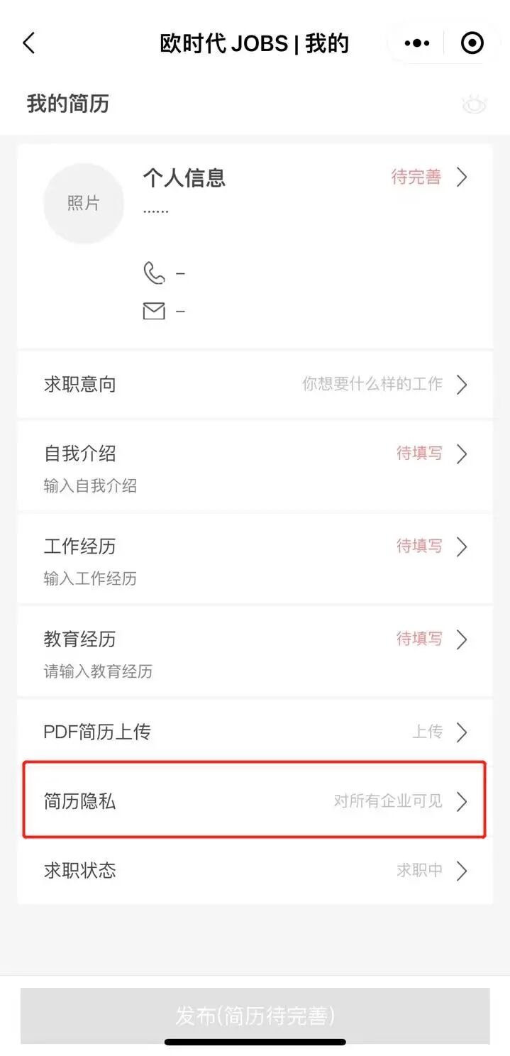 温馨提示:我们非常注重对您的个人隐私的保护!简历发布之前,您可以选择是否对所有企业公开自己的简历,或是仅对已投企业可见,还可以隐藏自己的联系方式。