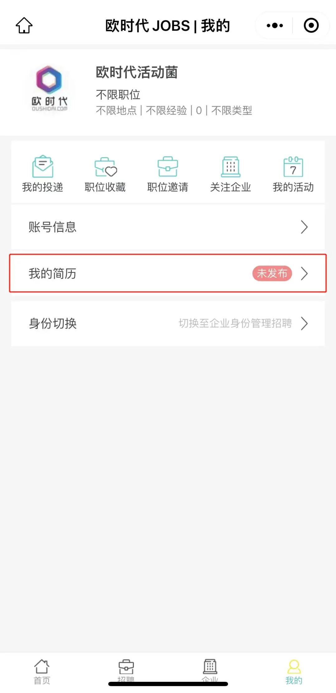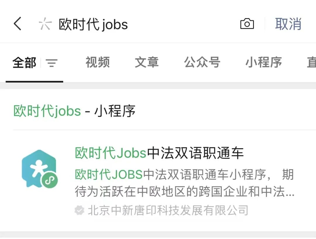 第一步:在微信中搜索“欧时代Jobs”小程序,找到并打开小程序。