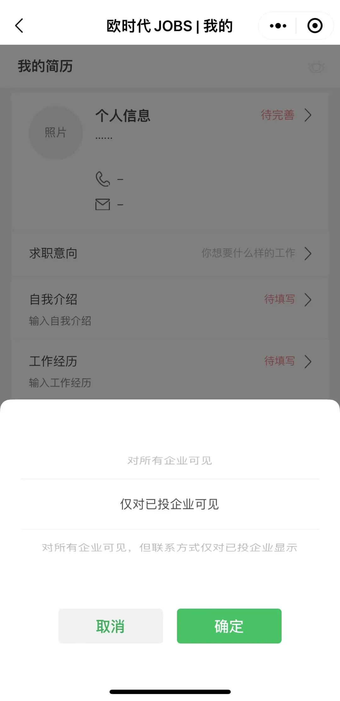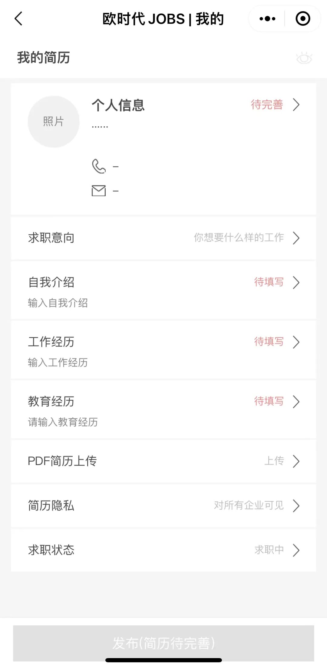 第二步:在小程序里完善个人信息并创建求职简历。