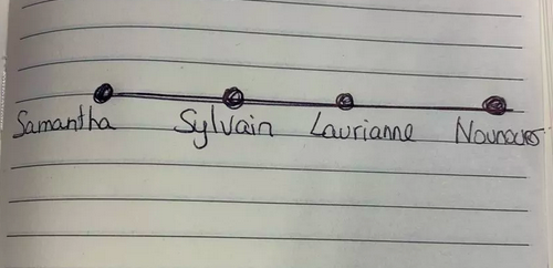 简单介绍一下他们的关系:萨曼莎(左一,女),28岁,是一名橱柜制造商,是西尔万(左二,男)的女友;西尔万和劳里安(左三,女)是夫妇,而且已为父母,在一起7年了;劳里安也是公务员努努斯(右一,男)的伴侣;萨曼莎和努努斯只是朋友,和劳里安也只是朋友。