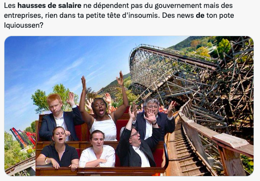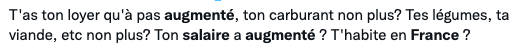 他的言下之意是:如果你在法国,很可能房租、油价、蔬菜、肉......都涨,就是工资没涨!