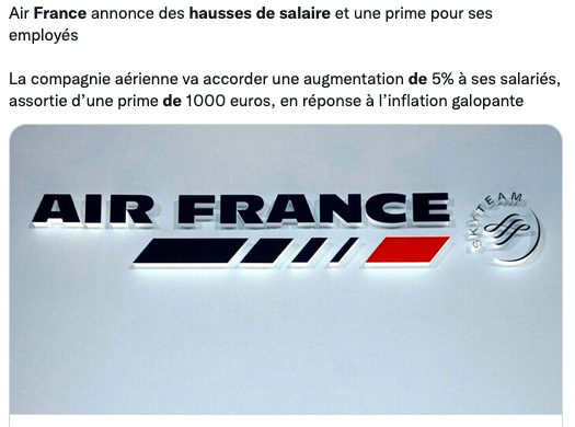 “法航宣布为员工增加工资和奖金:将为其员工增加5%的工资,并发放1000欧元的奖金,以应对飞速增长的通货膨胀。”