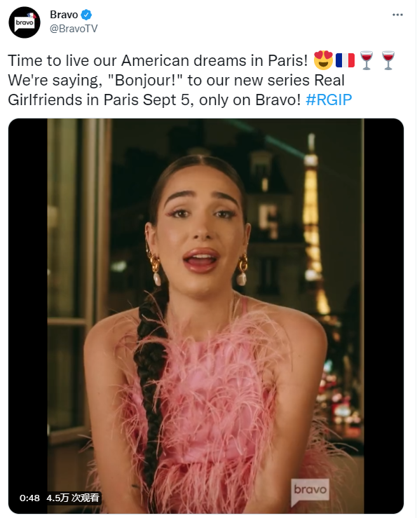 “是时候在巴黎实现我们的美国梦了!让我们齐声说“Bonjour!” 9 月 5 日,这部“Real Girlfriends in Paris”将准时与大家见面,请锁定Bravo平台!”