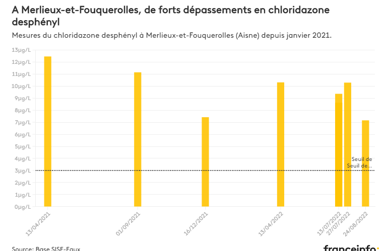 对自来水质量数据的分析凸显了另一个现象:2022 年,我们仍检测到高水平的农药分子(或其代谢物),但这些分子已被禁用多年。氯硝唑就是这种情况,自2021年1月1日起禁止使用,但目前为止,其代谢物仍存在于饮用水中。