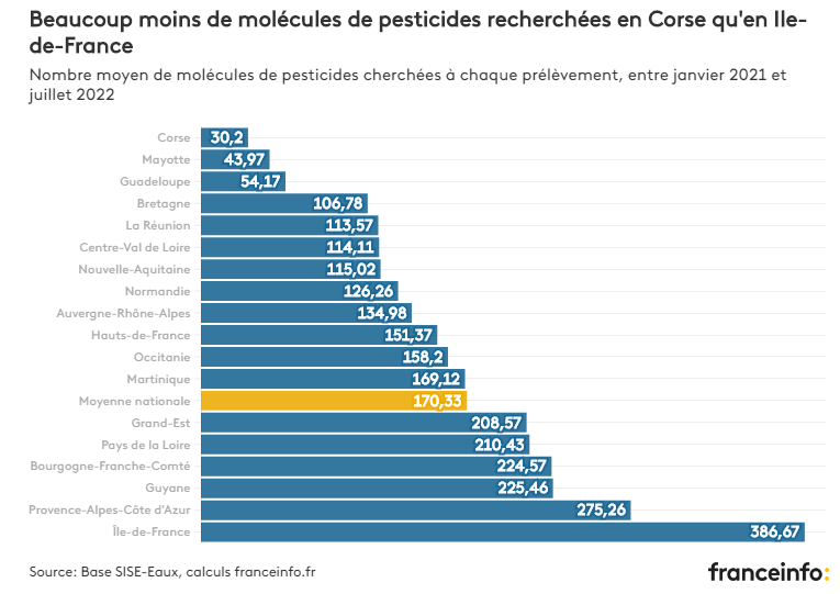 在2021年1月至2022年7月期间,法国卫生当局在现有的1000多种农药分子中随机搜索了170种。但监测物质的数量和清单因地区而异,甚至因征税而异。有时会有巨大的差异。例如,在科西嘉岛,每个样本平均测试30个分子,而在法兰西岛则为386个。