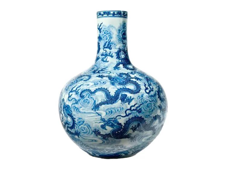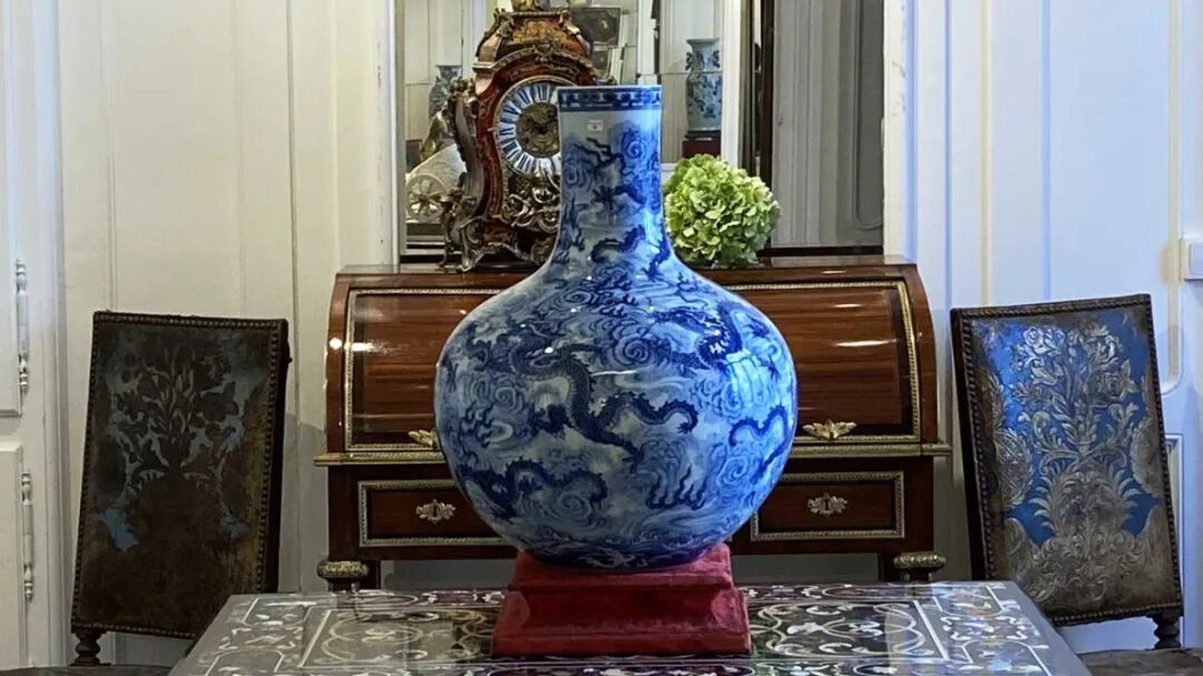 这件大花瓶饰有九条龙,在云中演化,高54厘米,造型罕见,名为“天球瓶”,其球形腹部象征着宇宙。