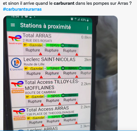 这不——加油站短缺更严重了!其中,上法兰西省和法兰西岛等地的情况尤其紧张:上法兰西省有54.8%的加油站受到影响;在法兰西岛,10月10日有44.9%的加油站缺油;在加来海峡,10月10日至少59.1%的加油站缺油(10月9日为41%);