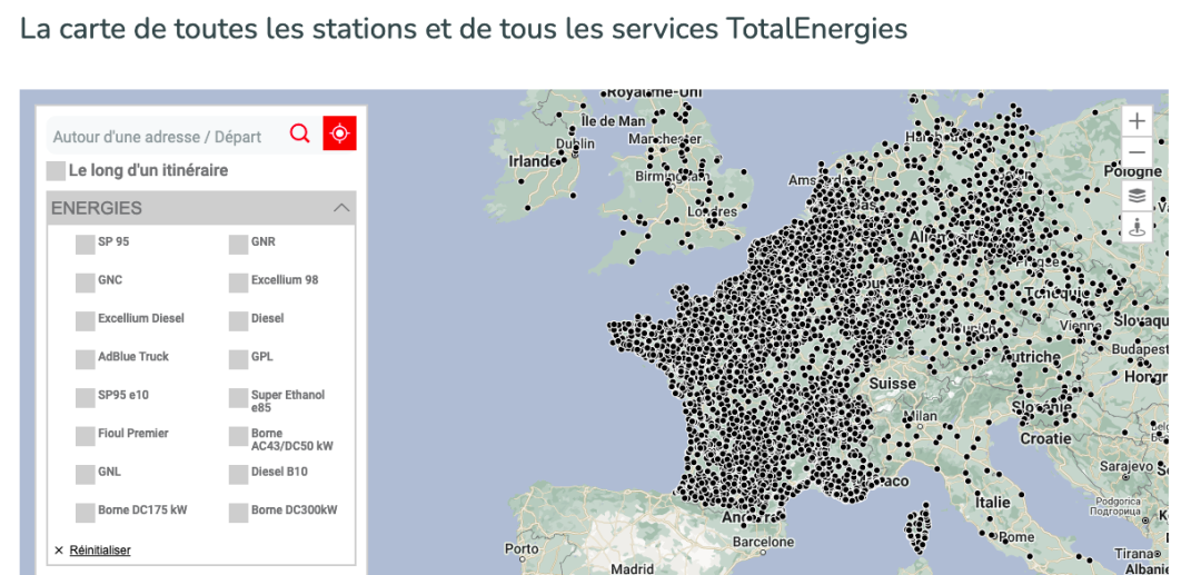 首先,可以到TotalEnergies的官网查看,它有详细列出其所有加油站的分布和状况: