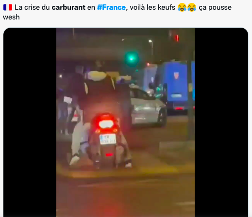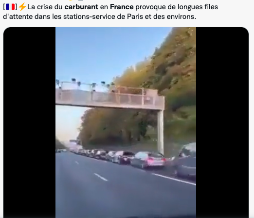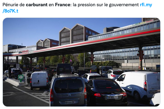 总理Elisabeth Borne保证,随着法国“战略库存 ”的“释放”,服务站的燃料供应紧张状况将“在本周内得到改善”。——10月10日是周一,掐指一算,留给总理的时间也不多了。